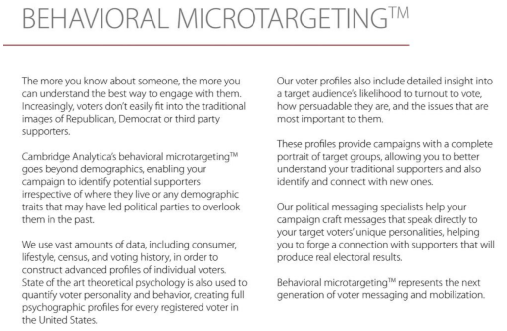 Here is an excerpt from Cambridge Analytica’s briefing pack in 2016: